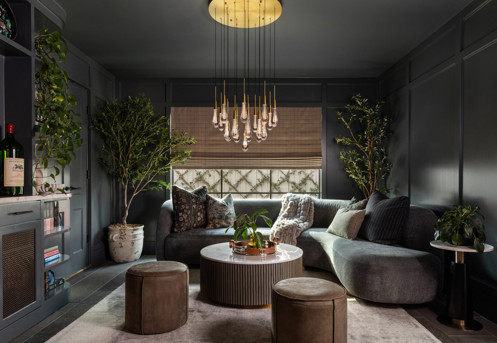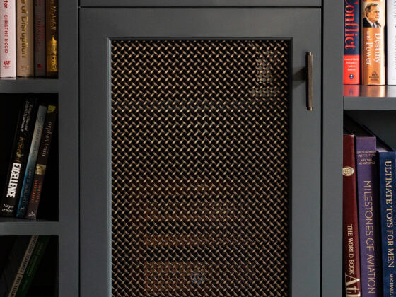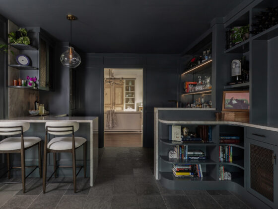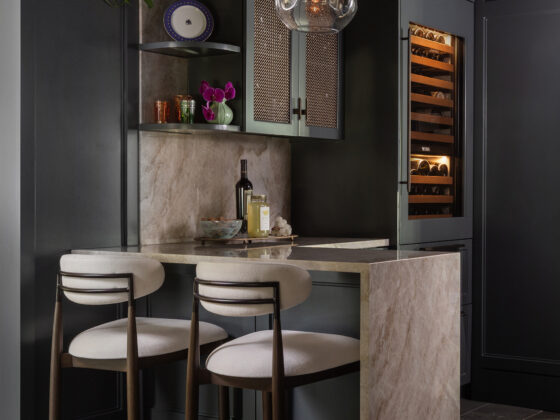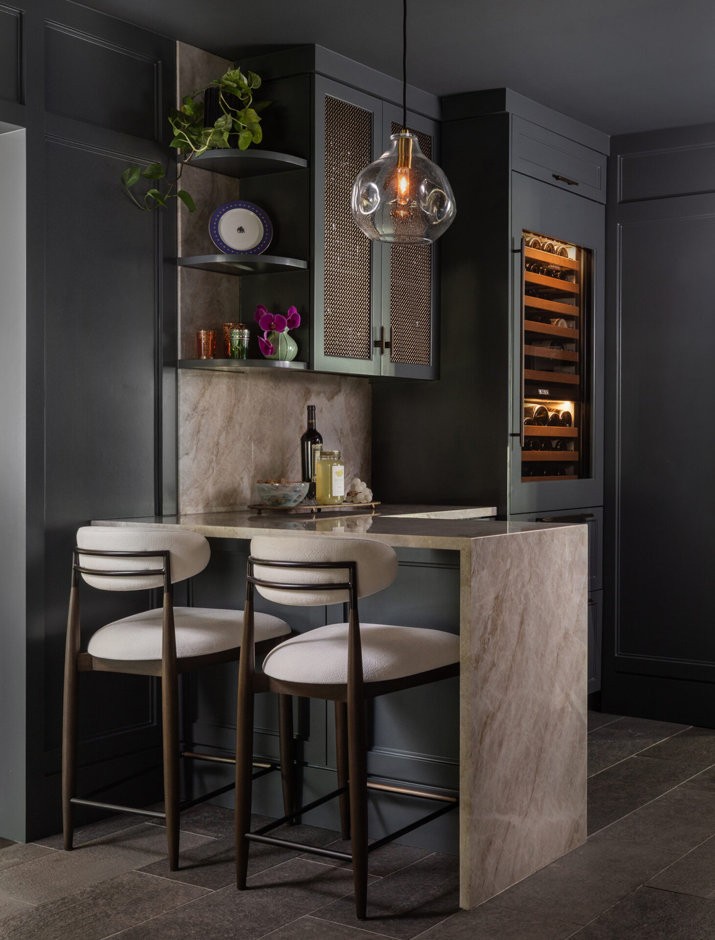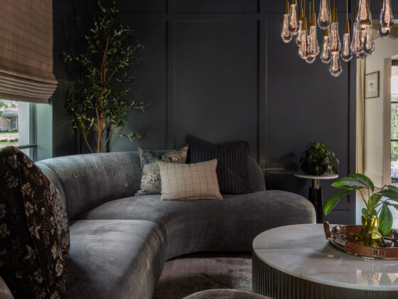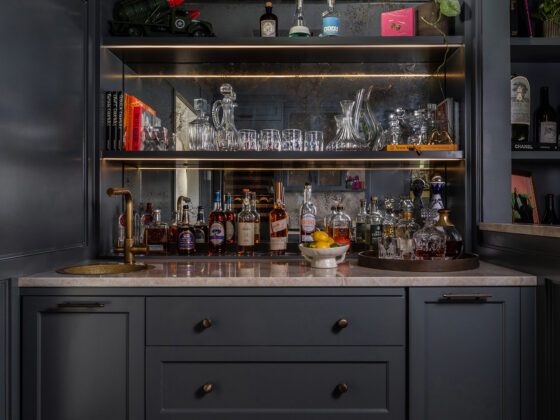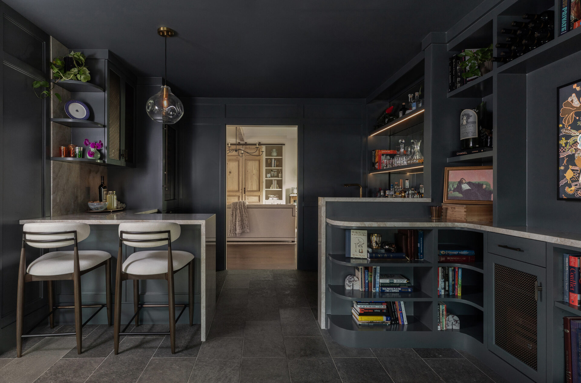Lynbrook Speakeasy – Houston, TX. Central to the plan of an established home in one of Houston’s iconic neighborhoods was a small collection of underutilized spaces that our clients had the vision of transforming into something special. They wanted their very own speakeasy, a respite in an otherwise busy household of managing children, schedules, careers, and travel. Contrasted with the rest of the home, which is mostly a bright off white and wood accents, the speakeasy takes on a mood all its own in the house, disappearing into the night with a darker vibe specifically for after-hours entertaining. The space is divided into two zones by waterfall stone countertops framing a wet bar, wine bar, wine fridge, and shelves for a variety of liqueurs. Opposite these countertops sits a more generous zone for seating and entertaining with plush furniture, book shelves, and the soft glow of pendant lighting. These two zones, while bound together in a dark color wash, and consistent flooring do display a noticeable contrast in masculinity vs femininity through careful selections and details. While the wet bar area features a somewhat industrial undertone of custom brass mesh cabinet faces, brass hardware and fixtures in front of an antiqued mirror backsplash, the gathering area is balanced with softer fabrics and greenery throughout. One can imagine many late nights spent with loved ones, from special occasions to weekly happy hours taking place in this oasis for many years to come.