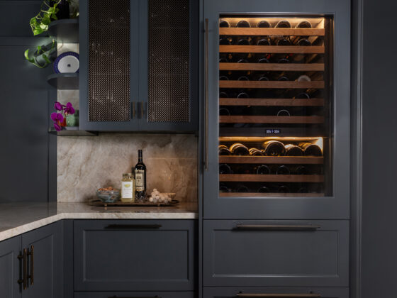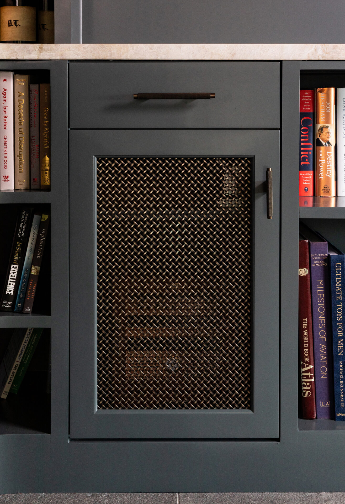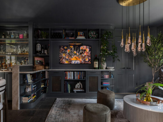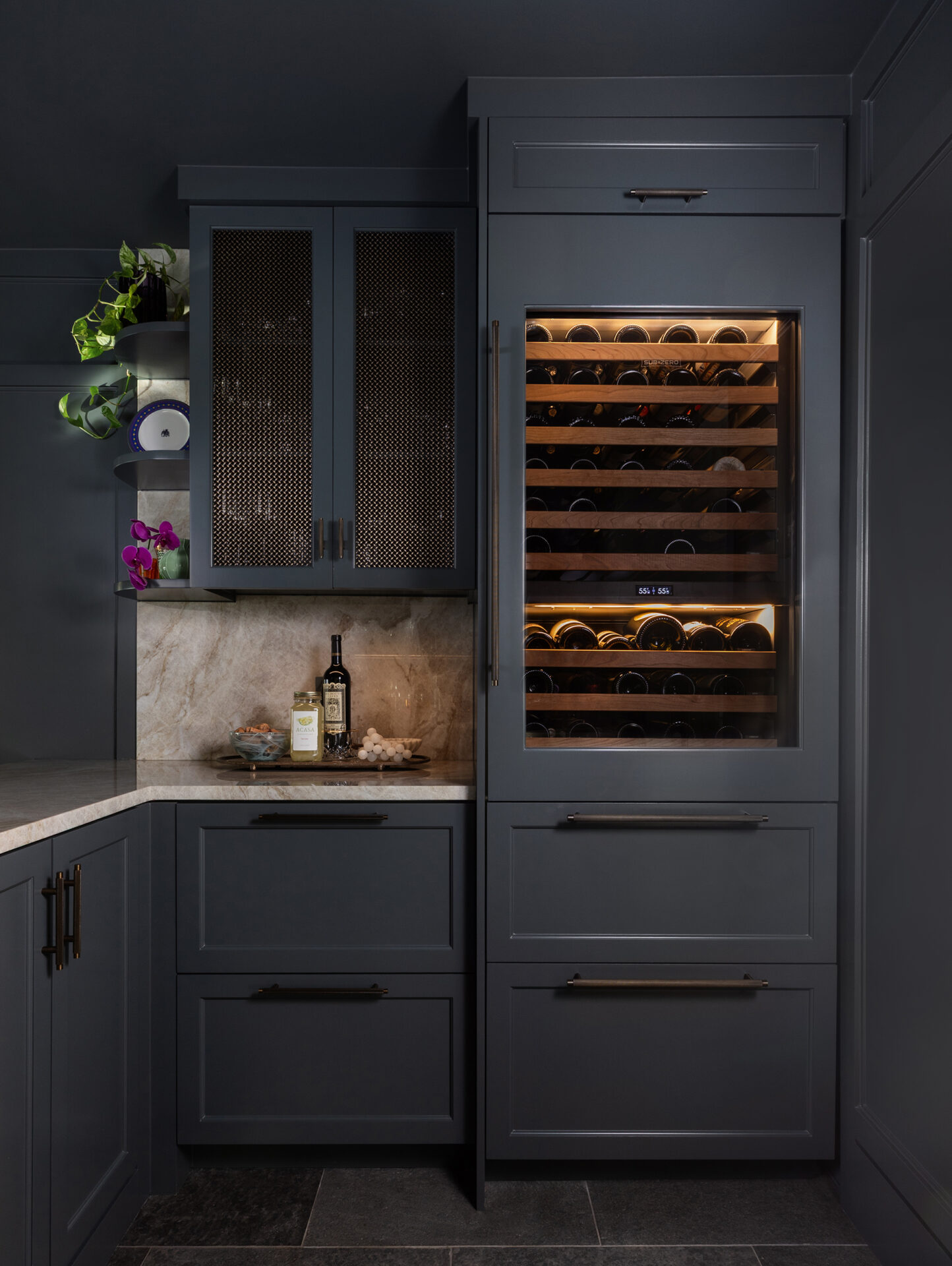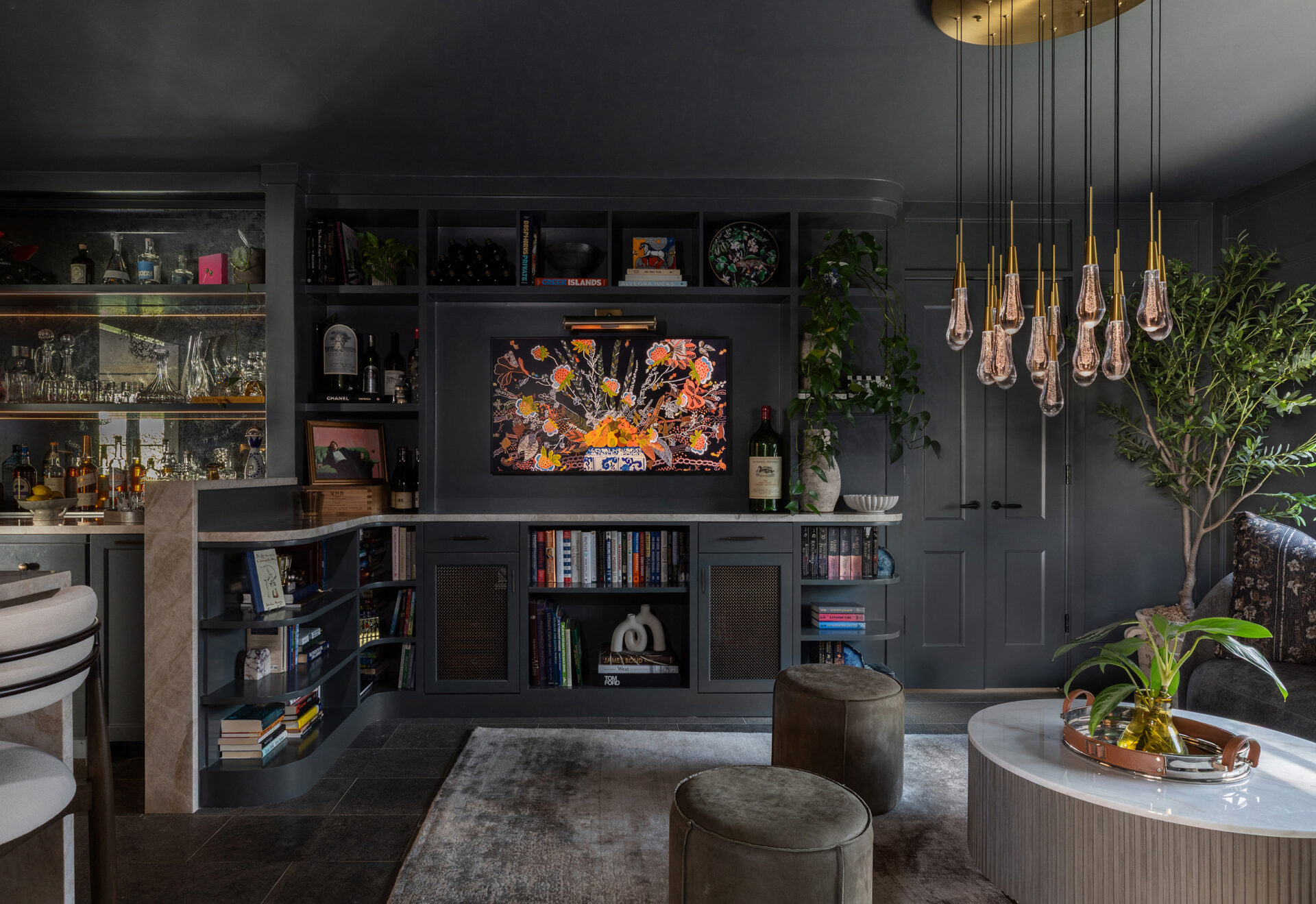 Lynbrook Speakeasy – Houston, TX. Central to the plan of an established home in one of Houston’s iconic neighborhoods was a small collection of underutilized spaces that our clients had the vision of transforming into something special. They wanted their very own speakeasy, a respite in an otherwise busy household of managing children, schedules, careers, and travel. Contrasted with the rest of the home, which is mostly a bright off white and wood accents, the speakeasy takes on a mood all its own in the house, disappearing into the night with a darker vibe specifically for after-hours entertaining. The space is divided into two zones by waterfall stone countertops framing a wet bar, wine bar, wine fridge, and shelves for a variety of liqueurs. Opposite these countertops sits a more generous zone for seating and entertaining with plush furniture, book shelves, and the soft glow of pendant lighting. These two zones, while bound together in a dark color wash, and consistent flooring do display a noticeable contrast in masculinity vs femininity through careful selections and details. While the wet bar area features a somewhat industrial undertone of custom brass mesh cabinet faces, brass hardware and fixtures in front of an antiqued mirror backsplash, the gathering area is balanced with softer fabrics and greenery throughout. One can imagine many late nights spent with loved ones, from special occasions to weekly happy hours taking place in this oasis for many years to come.