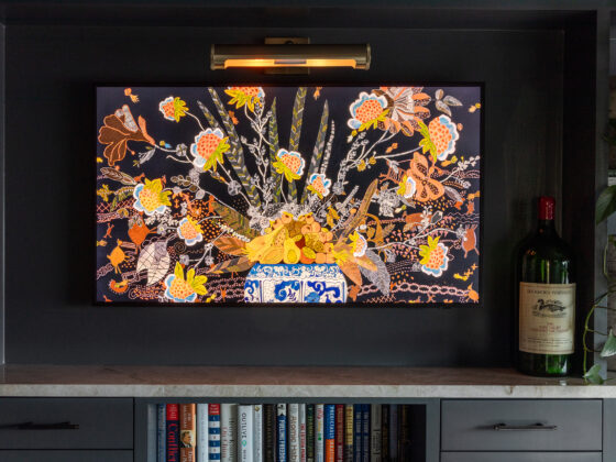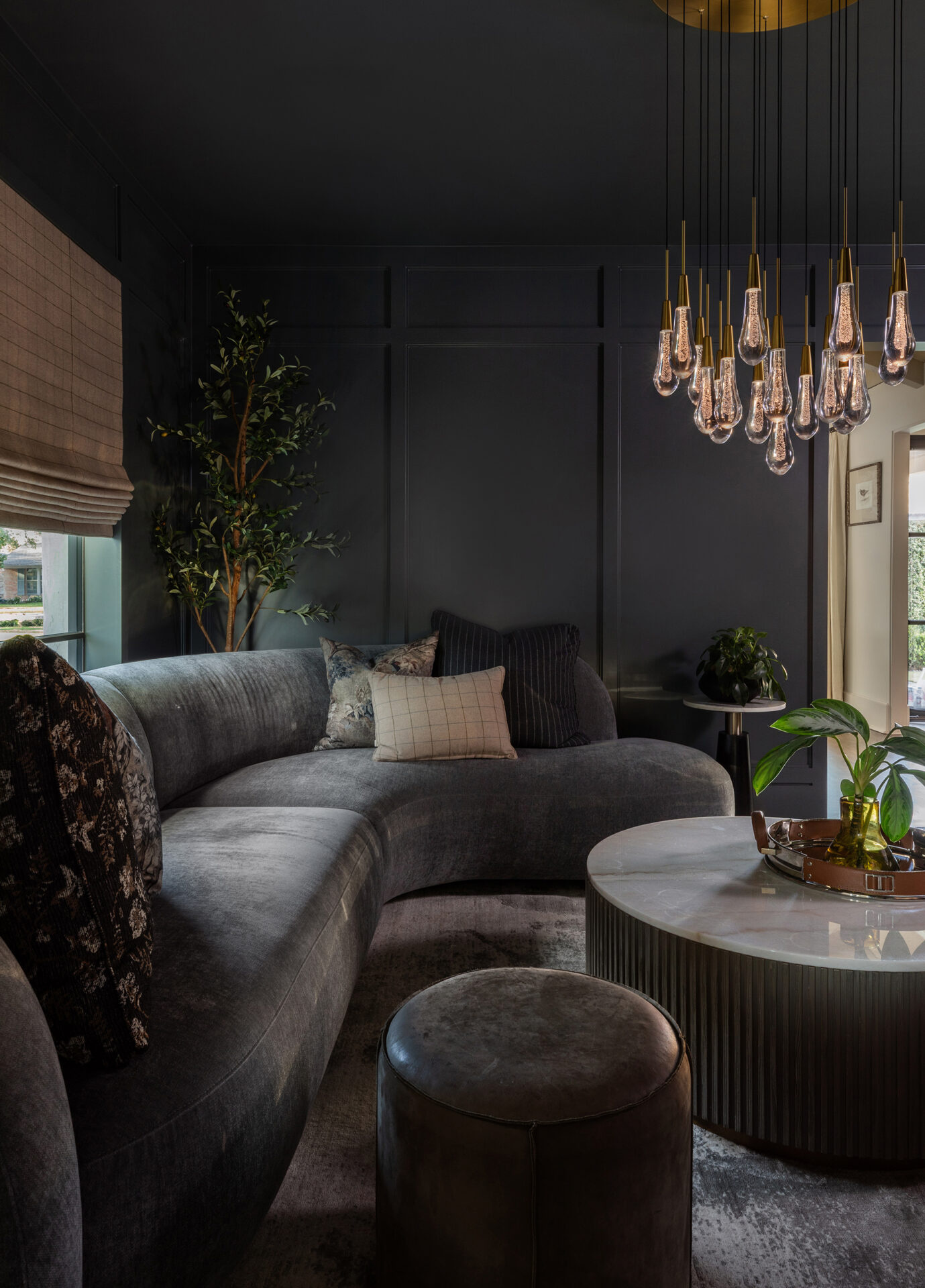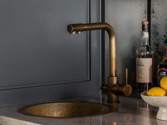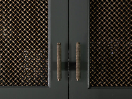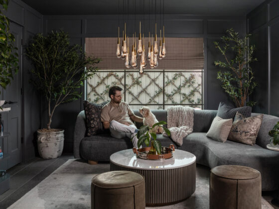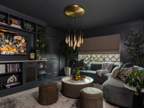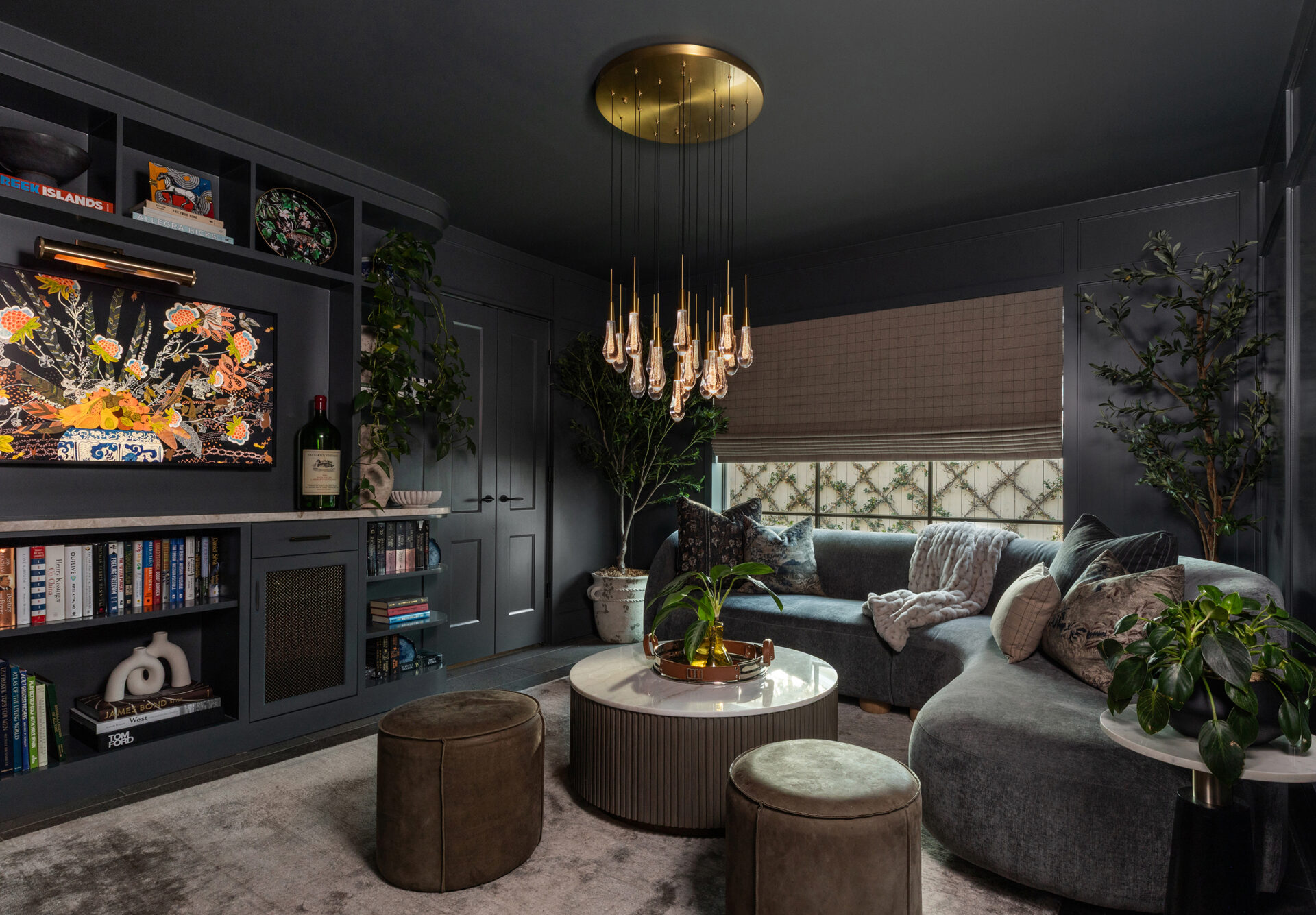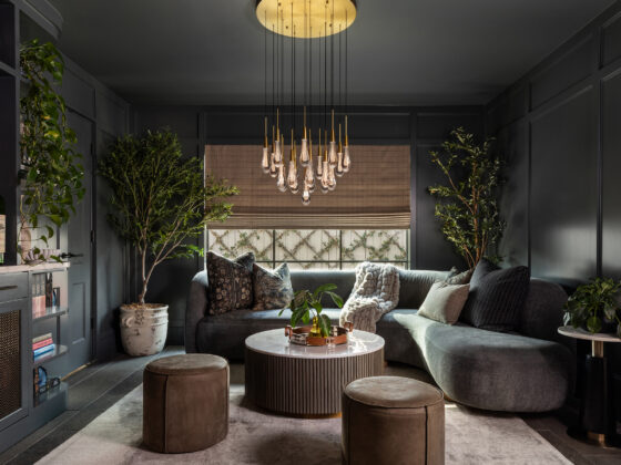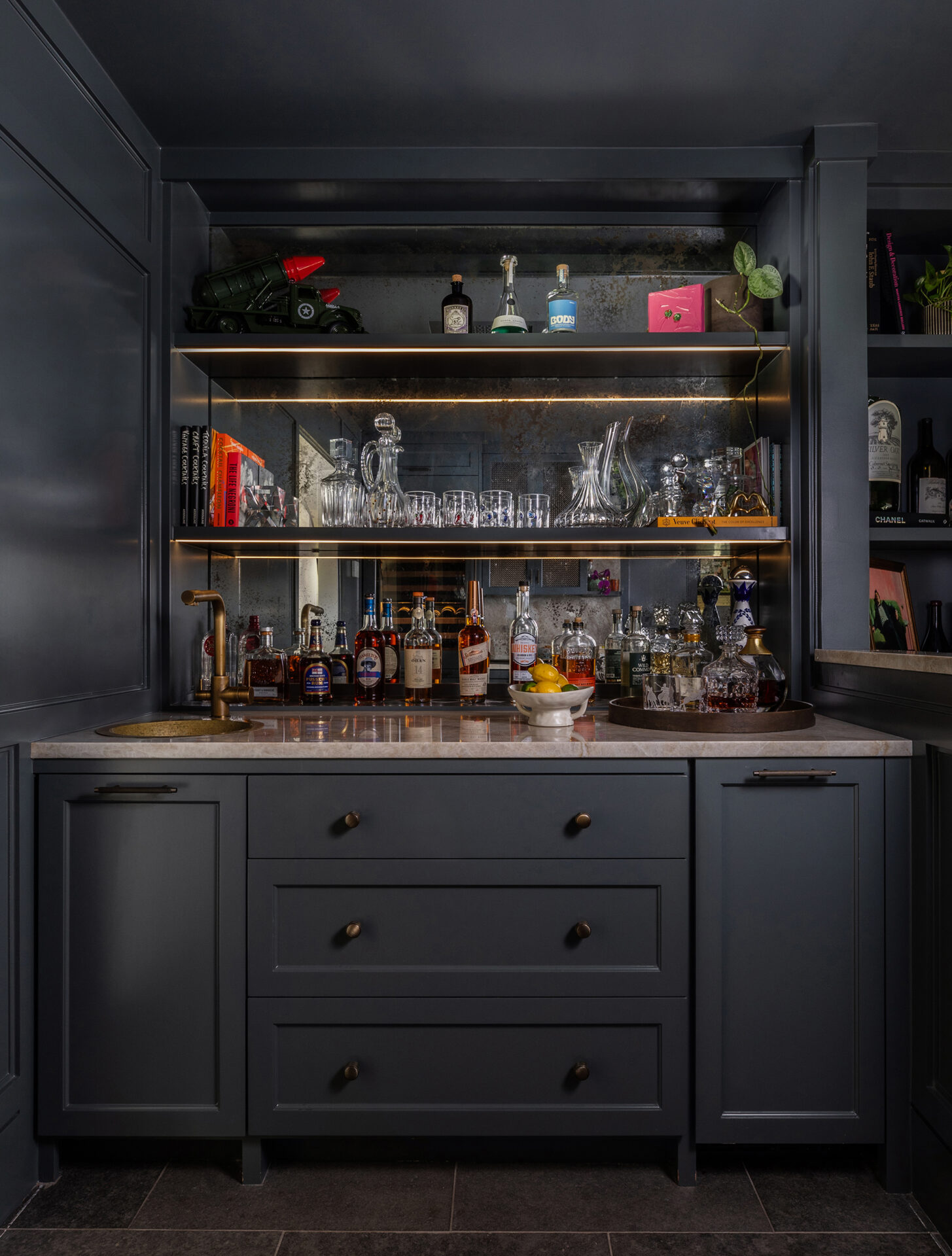 Lynbrook Speakeasy – Houston, TX. Central to the plan of an established home in one of Houston’s iconic neighborhoods was a small collection of underutilized spaces that our clients had the vision of transforming into something special. They wanted their very own speakeasy, a respite in an otherwise busy household of managing children, schedules, careers, and travel. Contrasted with the rest of the home, which is mostly a bright off white and wood accents, the speakeasy takes on a mood all its own in the house, disappearing into the night with a darker vibe specifically for after-hours entertaining. The space is divided into two zones by waterfall stone countertops framing a wet bar, wine bar, wine fridge, and shelves for a variety of liqueurs. Opposite these countertops sits a more generous zone for seating and entertaining with plush furniture, book shelves, and the soft glow of pendant lighting. These two zones, while bound together in a dark color wash, and consistent flooring do display a noticeable contrast in masculinity vs femininity through careful selections and details. While the wet bar area features a somewhat industrial undertone of custom brass mesh cabinet faces, brass hardware and fixtures in front of an antiqued mirror backsplash, the gathering area is balanced with softer fabrics and greenery throughout. One can imagine many late nights spent with loved ones, from special occasions to weekly happy hours taking place in this oasis for many years to come.