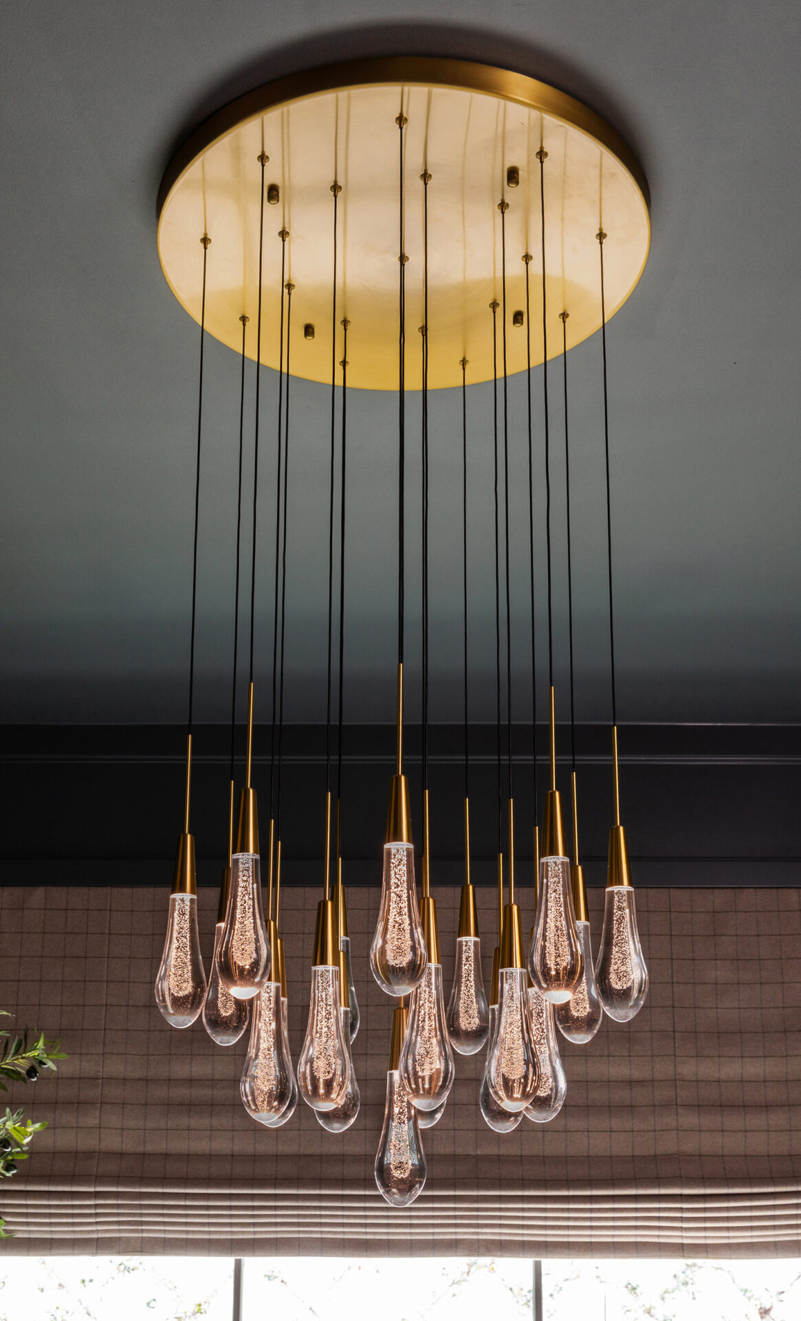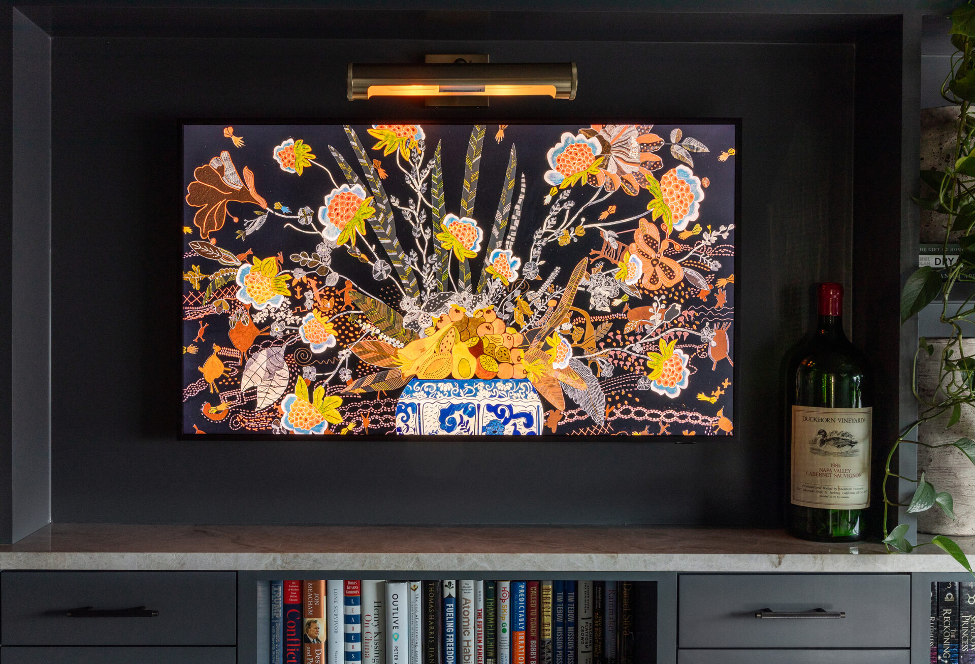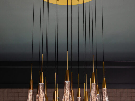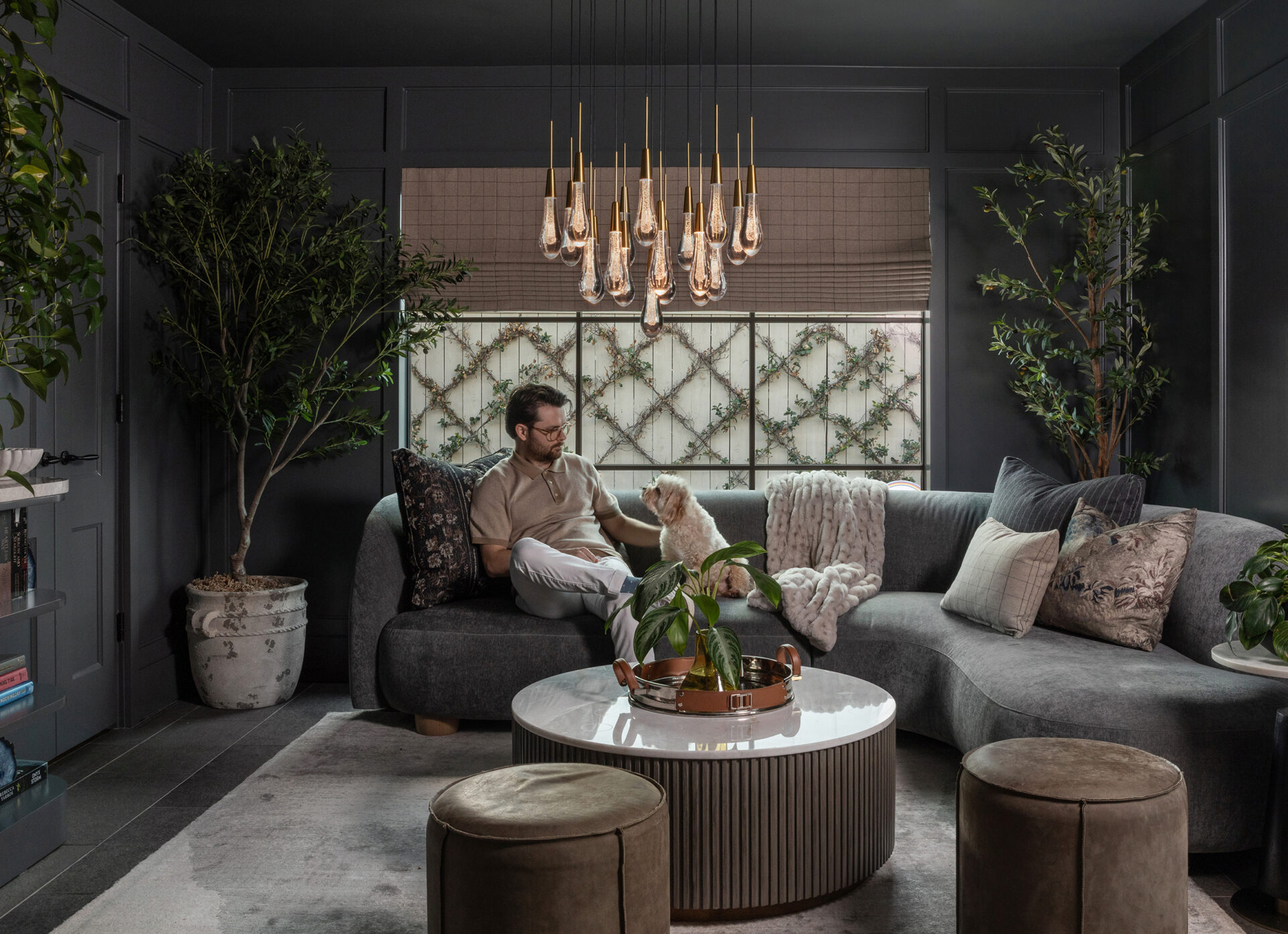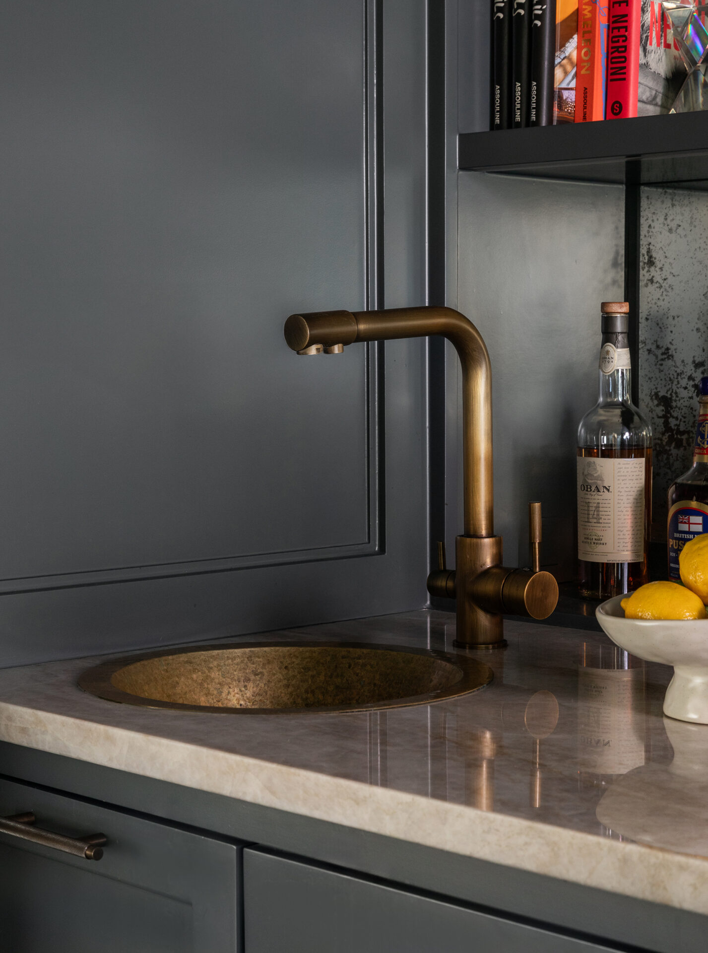 Lynbrook Speakeasy – Houston, TX. Central to the plan of an established home in one of Houston’s iconic neighborhoods was a small collection of underutilized spaces that our clients had the vision of transforming into something special. They wanted their very own speakeasy, a respite in an otherwise busy household of managing children, schedules, careers, and travel. Contrasted with the rest of the home, which is mostly a bright off white and wood accents, the speakeasy takes on a mood all its own in the house, disappearing into the night with a darker vibe specifically for after-hours entertaining. The space is divided into two zones by waterfall stone countertops framing a wet bar, wine bar, wine fridge, and shelves for a variety of liqueurs. Opposite these countertops sits a more generous zone for seating and entertaining with plush furniture, book shelves, and the soft glow of pendant lighting. These two zones, while bound together in a dark color wash, and consistent flooring do display a noticeable contrast in masculinity vs femininity through careful selections and details. While the wet bar area features a somewhat industrial undertone of custom brass mesh cabinet faces, brass hardware and fixtures in front of an antiqued mirror backsplash, the gathering area is balanced with softer fabrics and greenery throughout. One can imagine many late nights spent with loved ones, from special occasions to weekly happy hours taking place in this oasis for many years to come.
